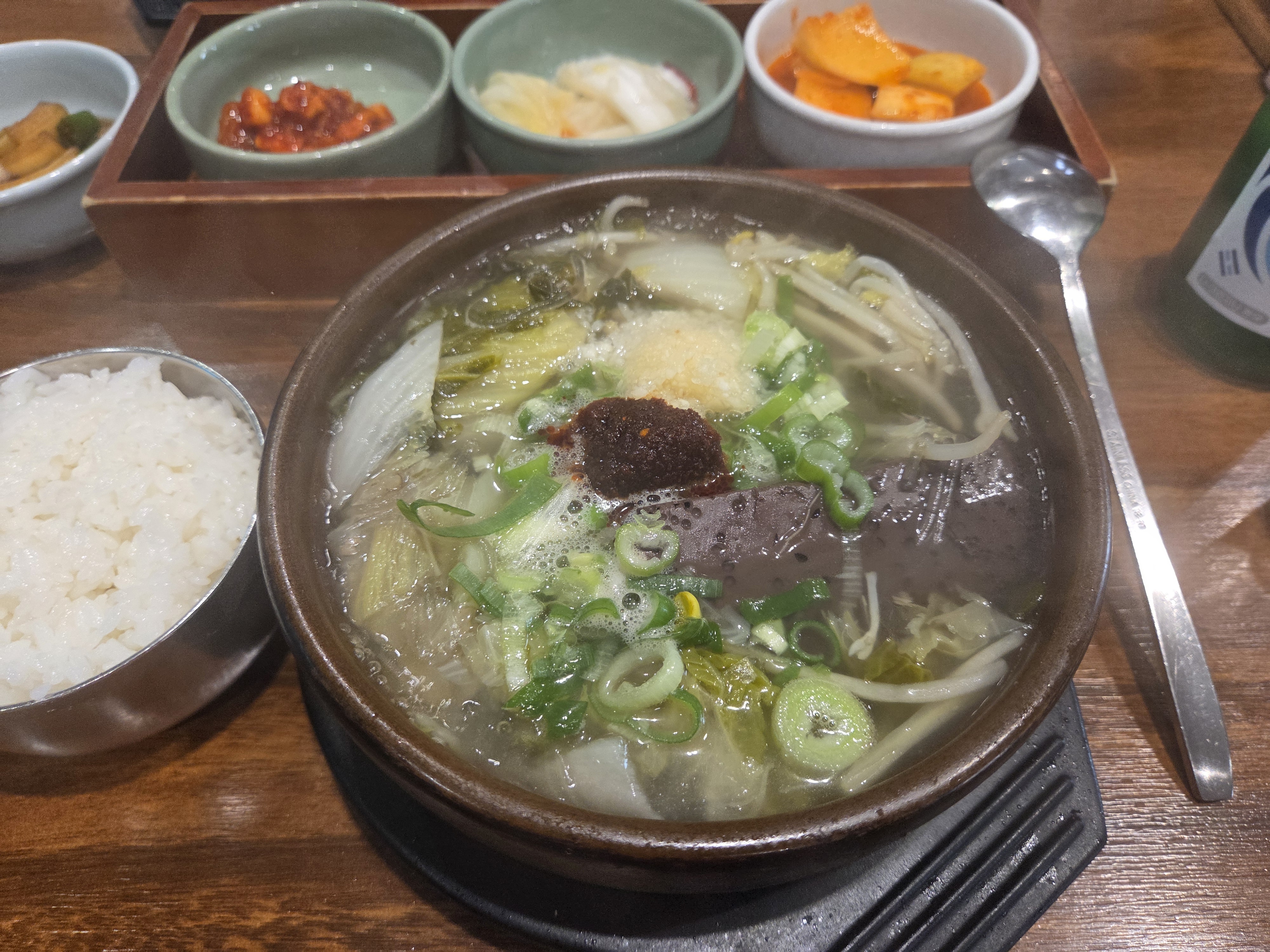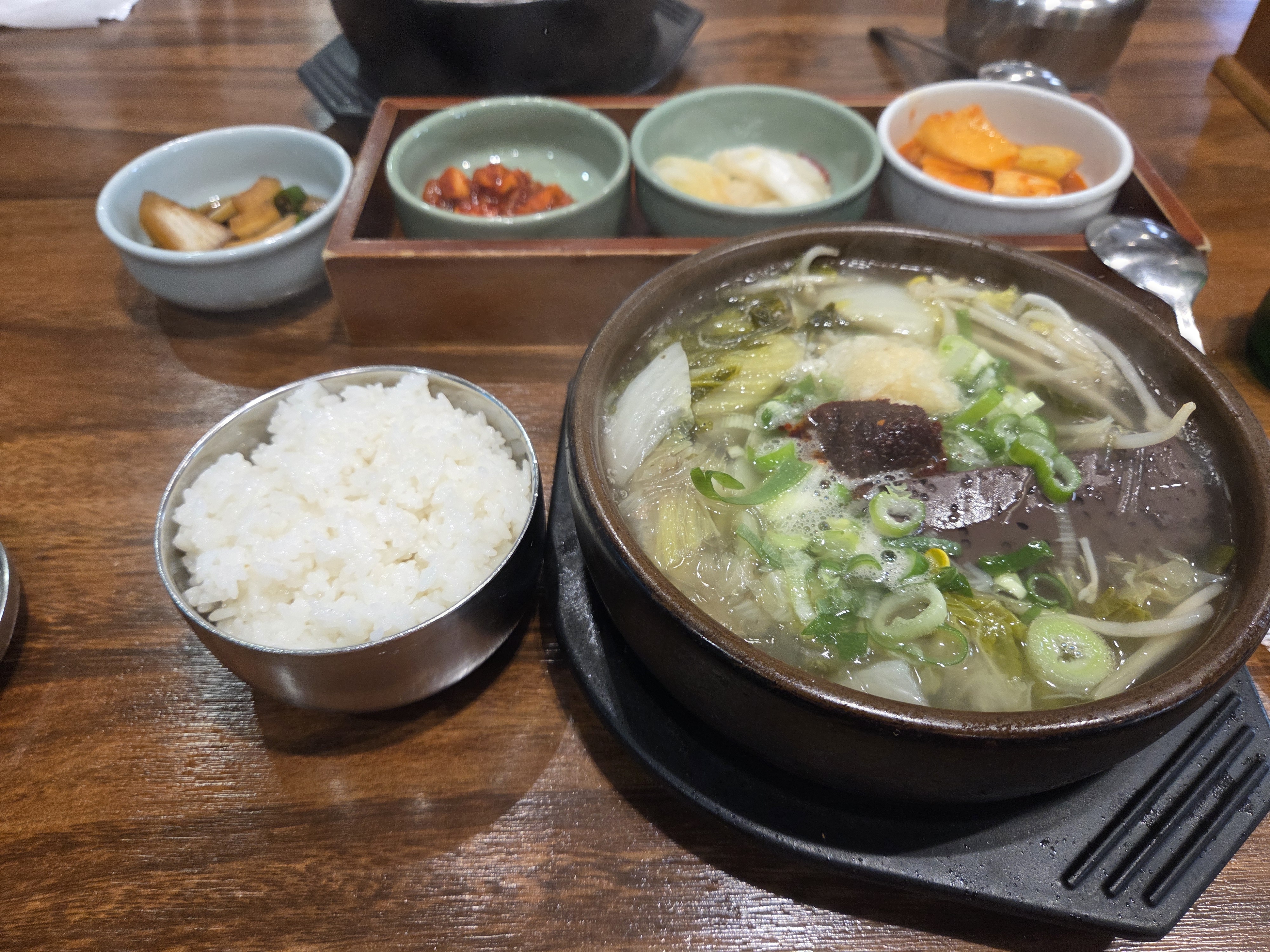 펄펄 끓는 뚝배기에 큼직한 선지 한 덩어리.단배추.소고기.당면이 간마늘과 다대기랑 같이 들어있네요..