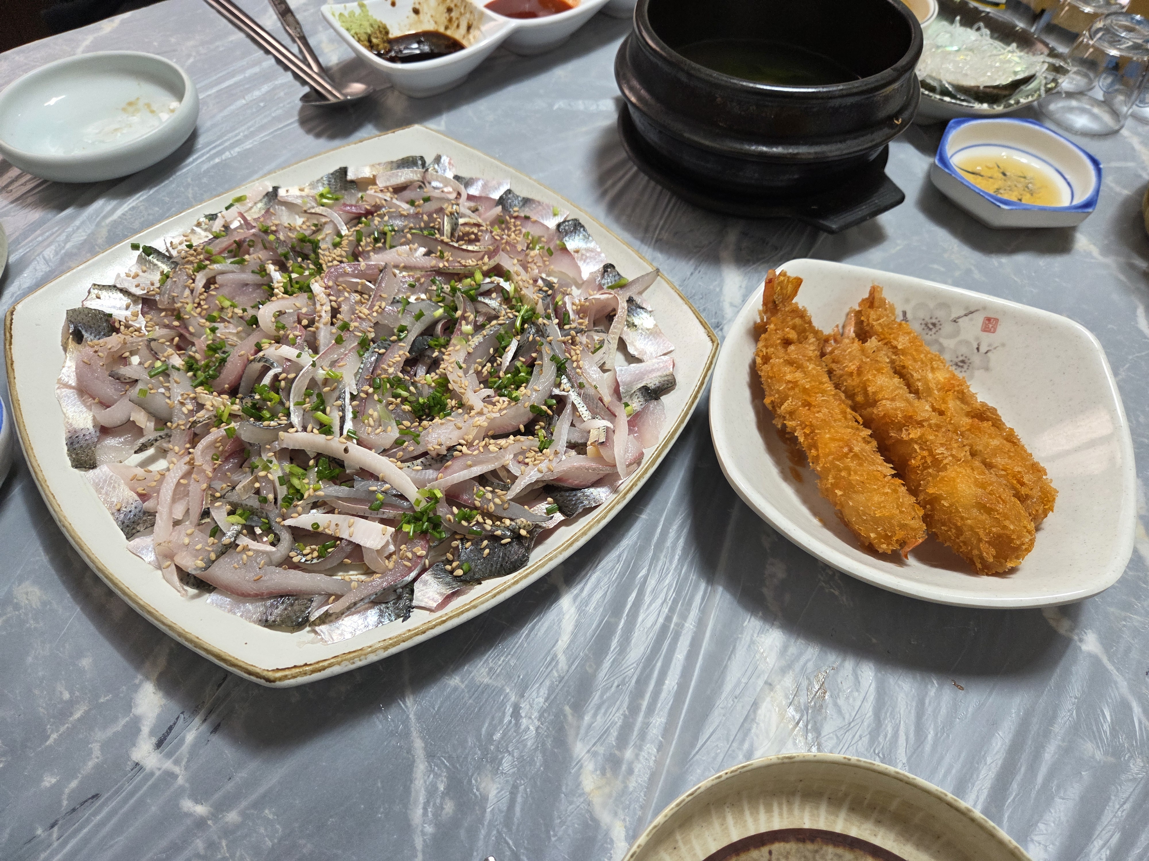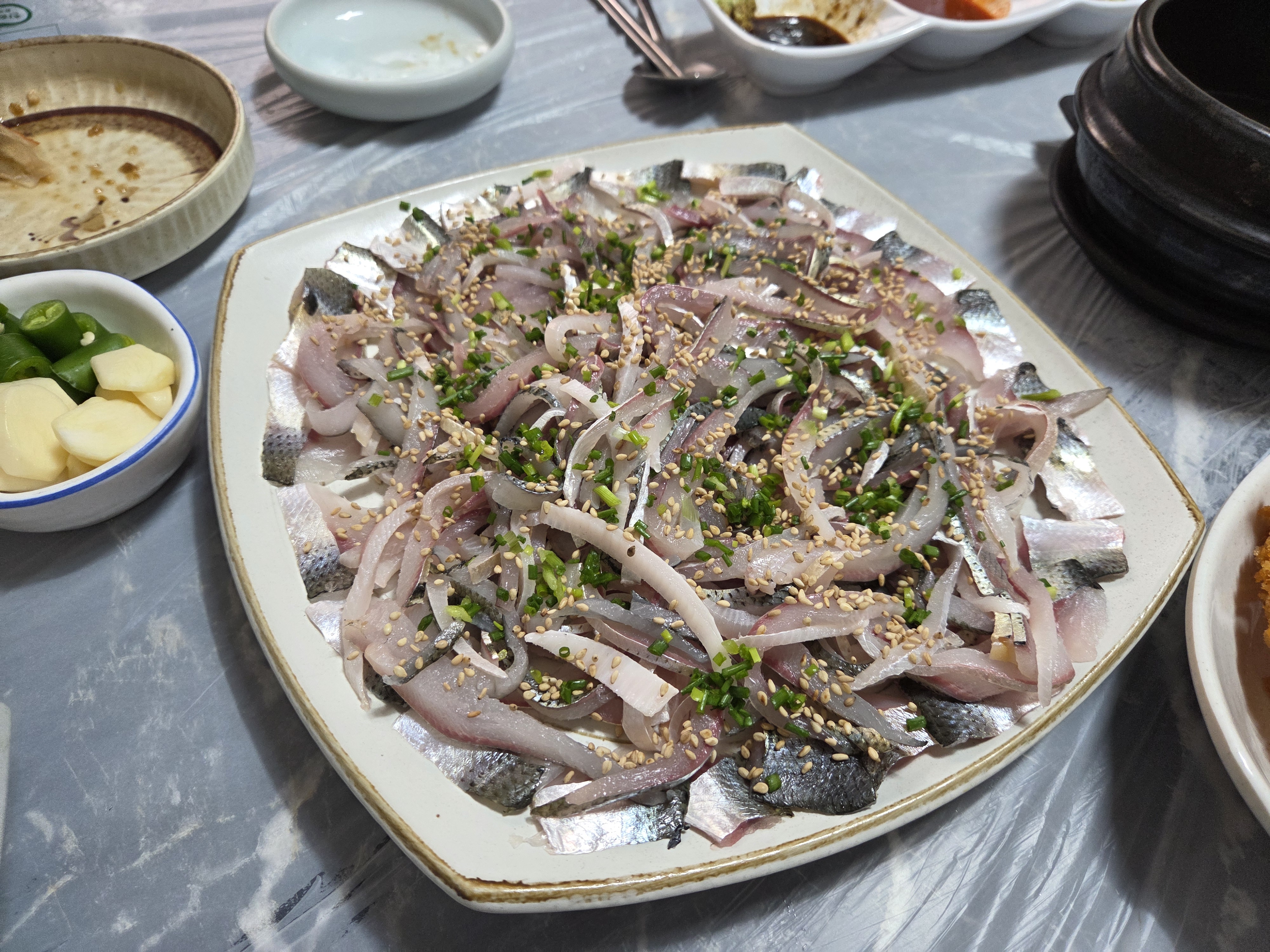 메인 전어회가 등장..가장자리엔 전어포가 자리잡고 가운데는 길게 국수썰기로..푸짐하네요..