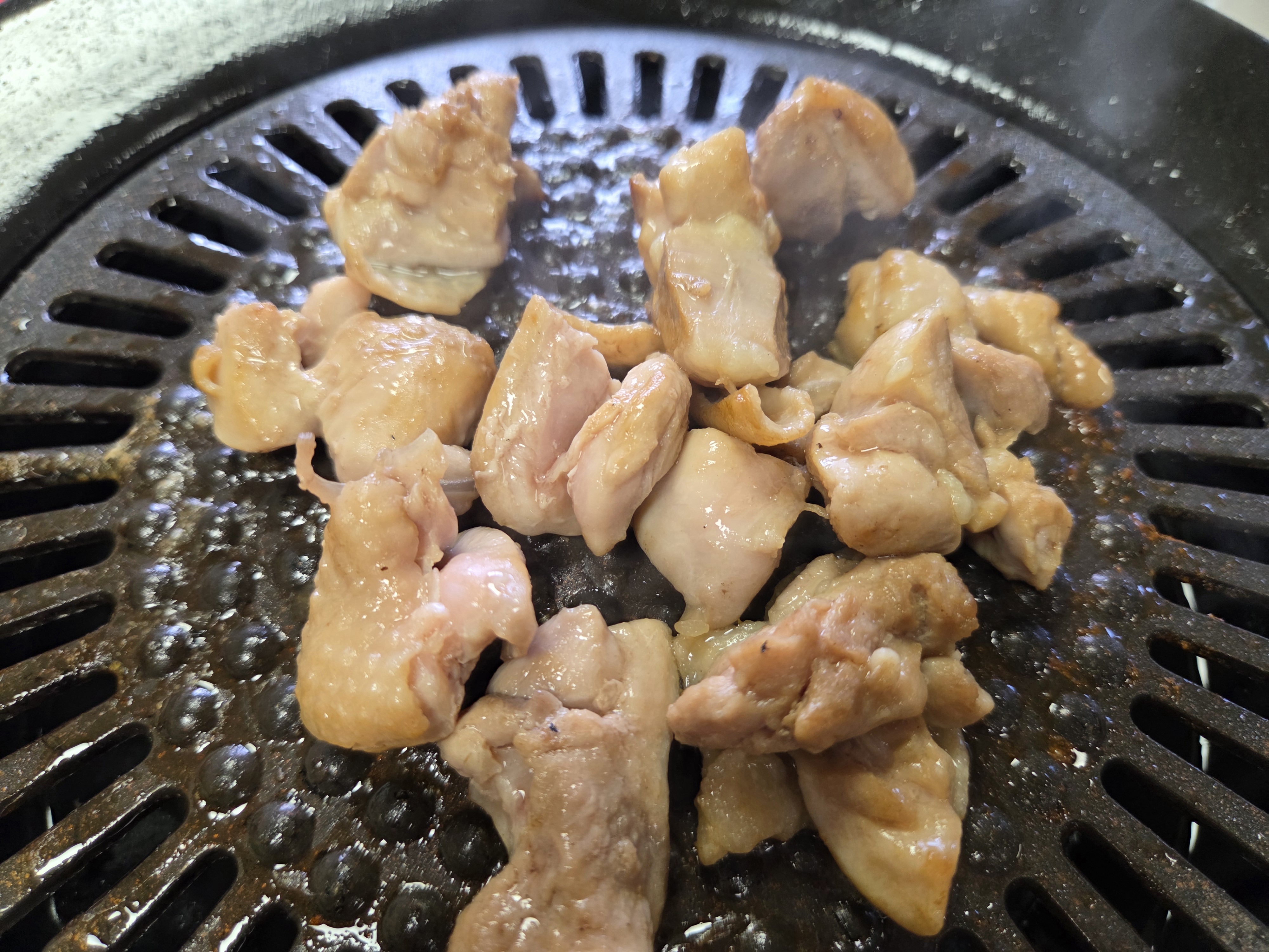 가스불로 달궈진 불판에 소고기부터 먼저 구워서 소금에