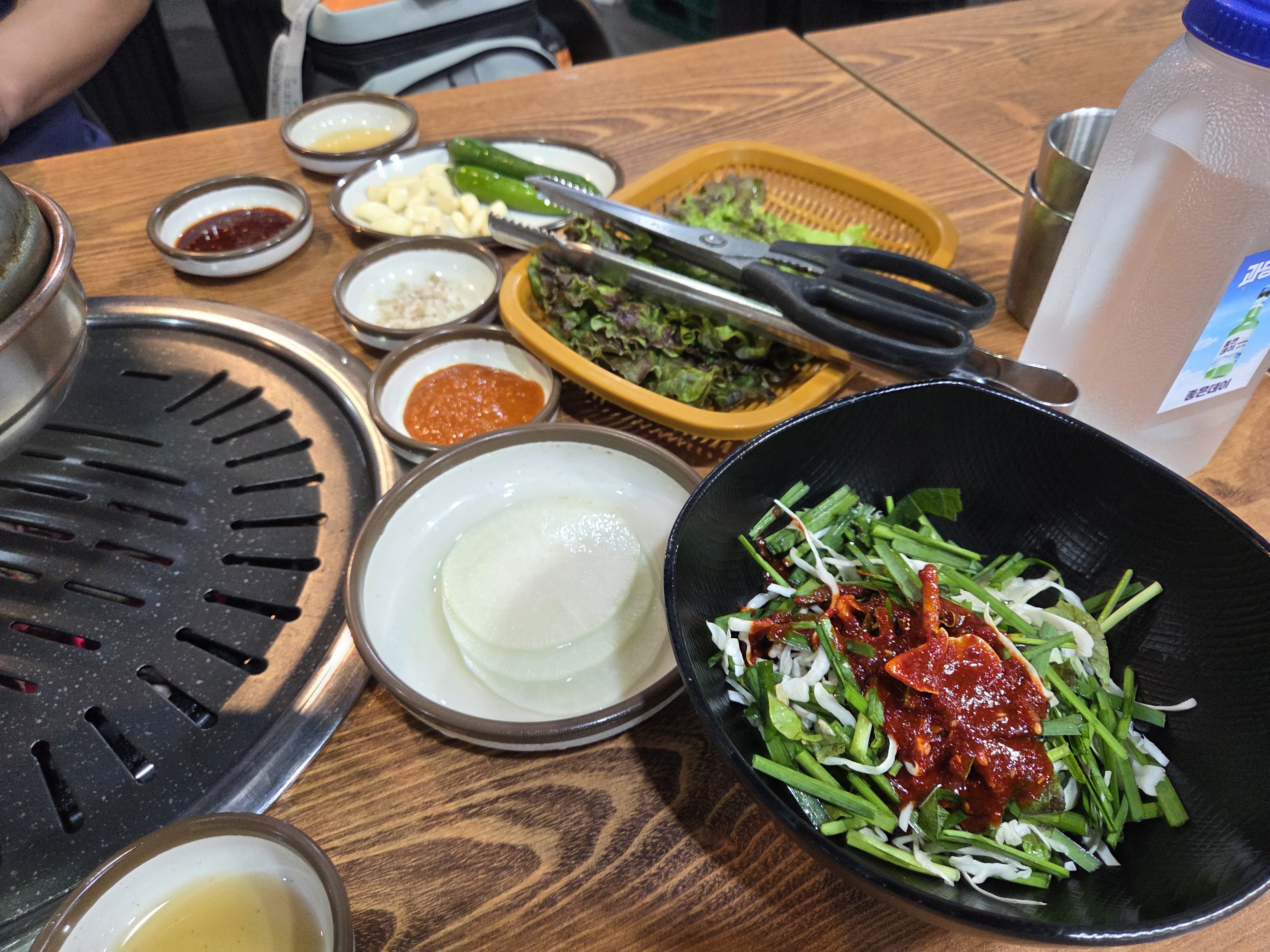 기본 찬들 나오고 숯불도..