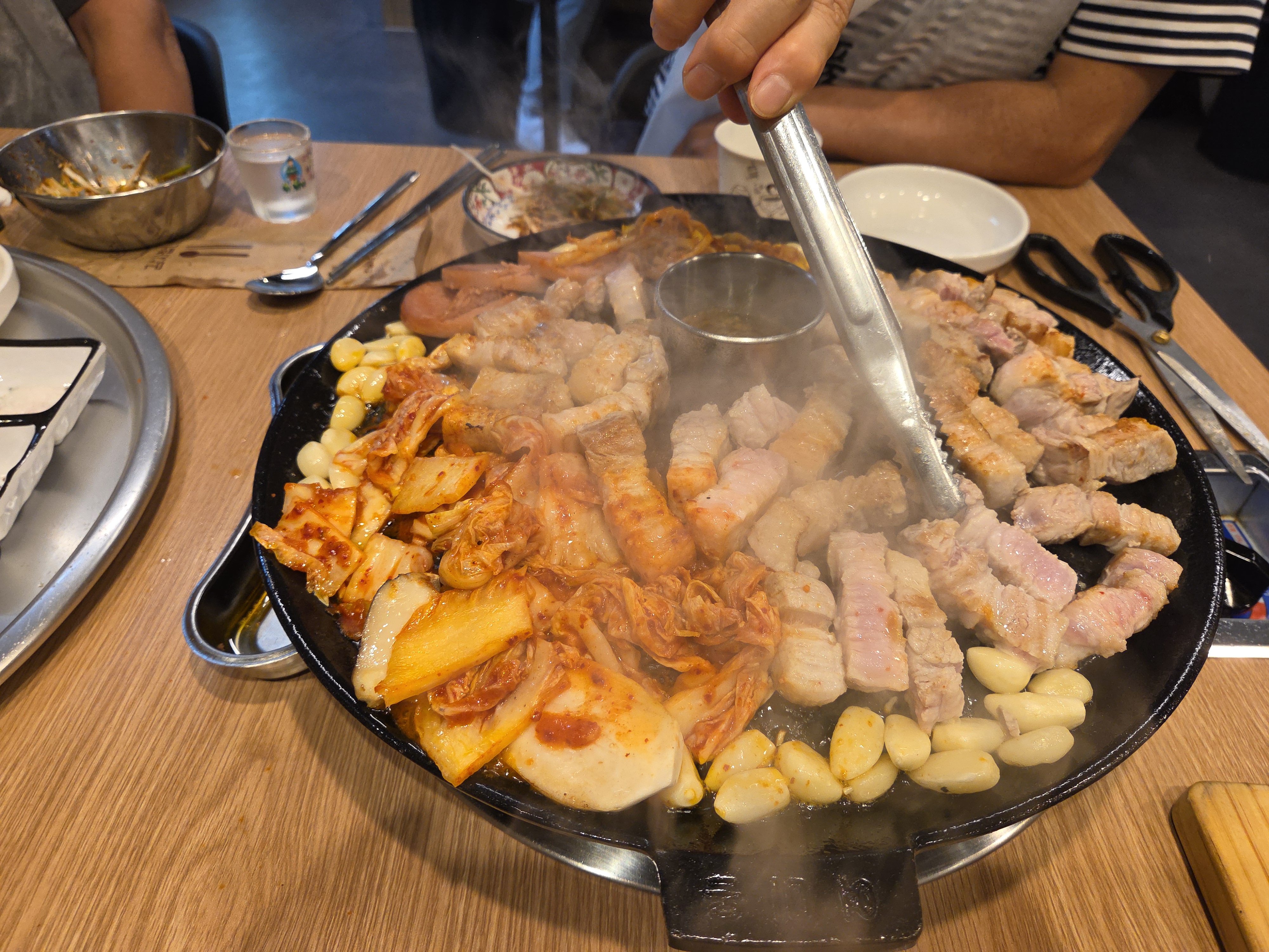 고기 올리고..멜젓도.삼겹살 기름이 좀 나오면 김치.콩나물 마늘도 같이 올려 구워줍니다.