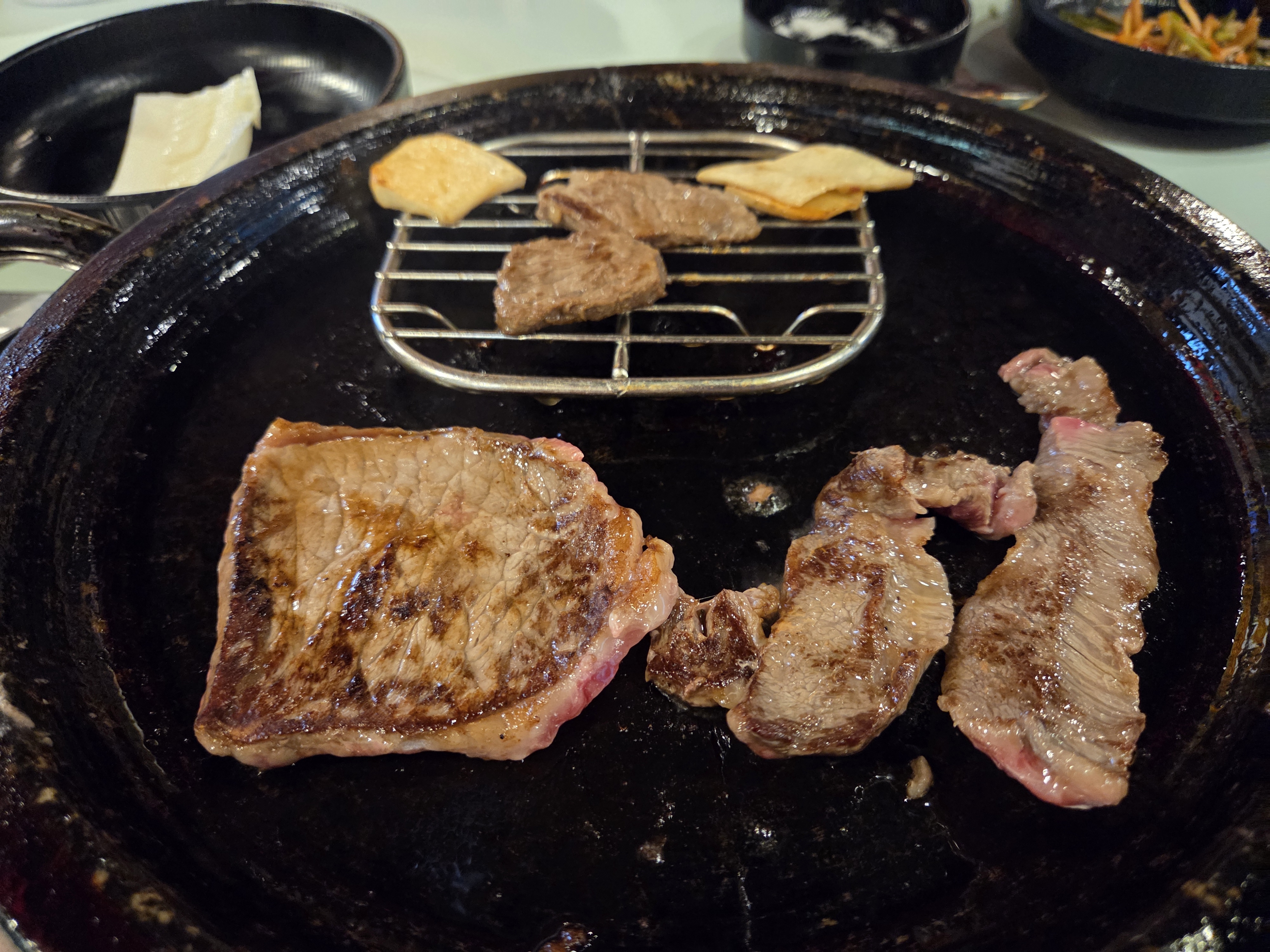 상추에 고기.마늘.쌈장.파채올려 한 입 그득.부드러운 식감에 한우 풍미가 좋네요..와사비랑도 먹고