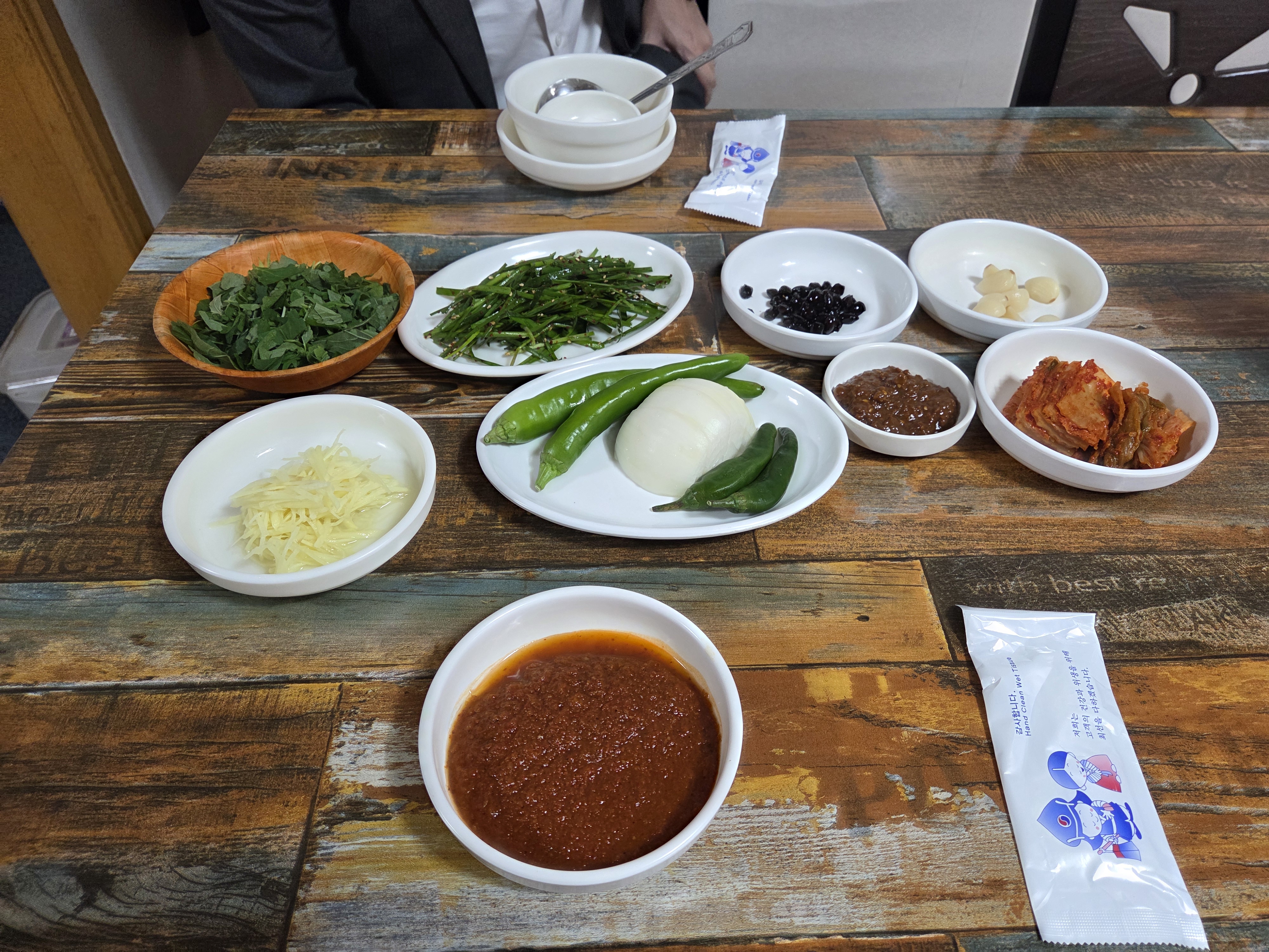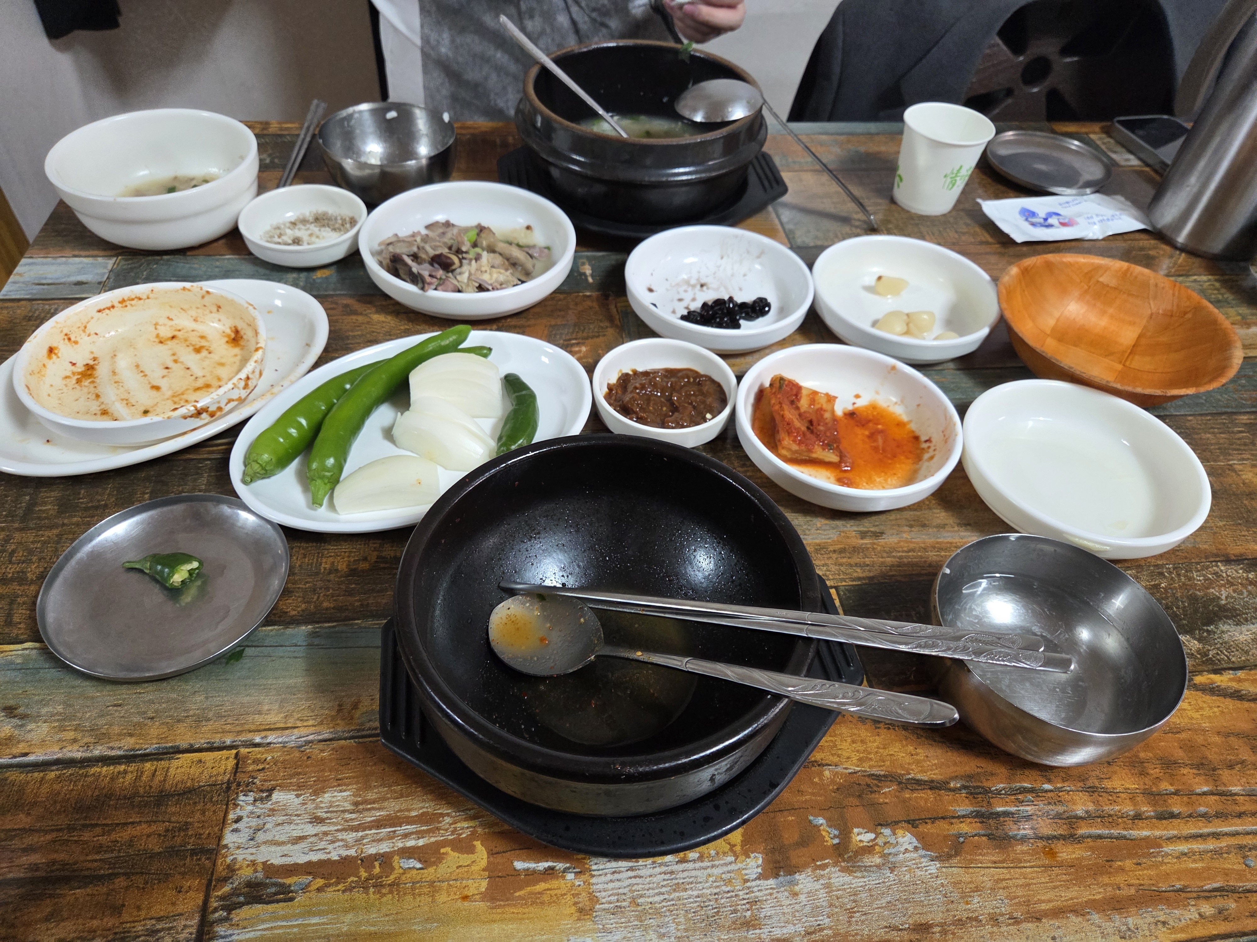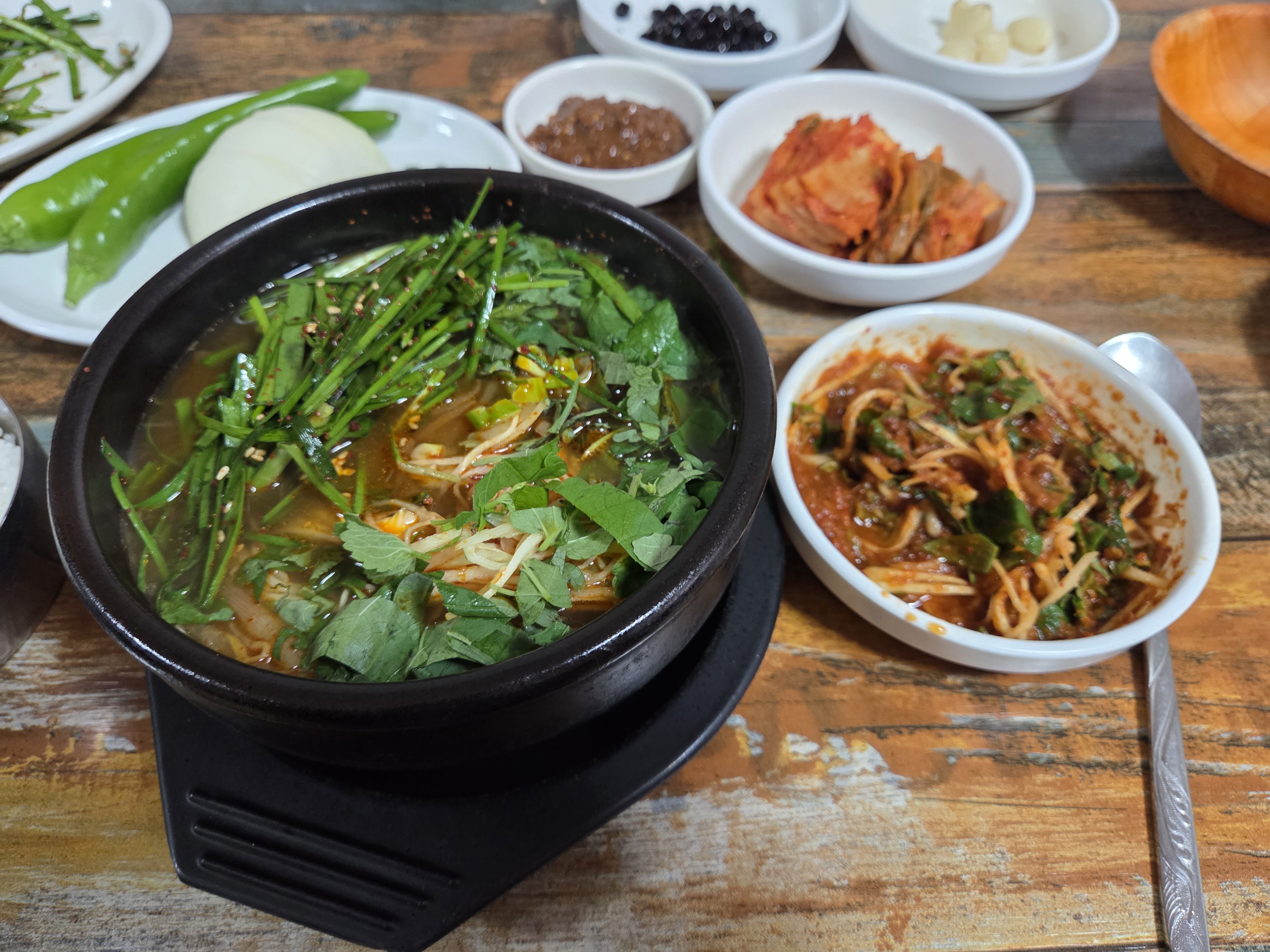 펄펄 끓는 뚝배기에 방아 생강채 부추무침 식초 첨가하여 휘휘 저어 고기부터 양념장에 찍어 먹고..공기밥 반은 따로 먹다가
