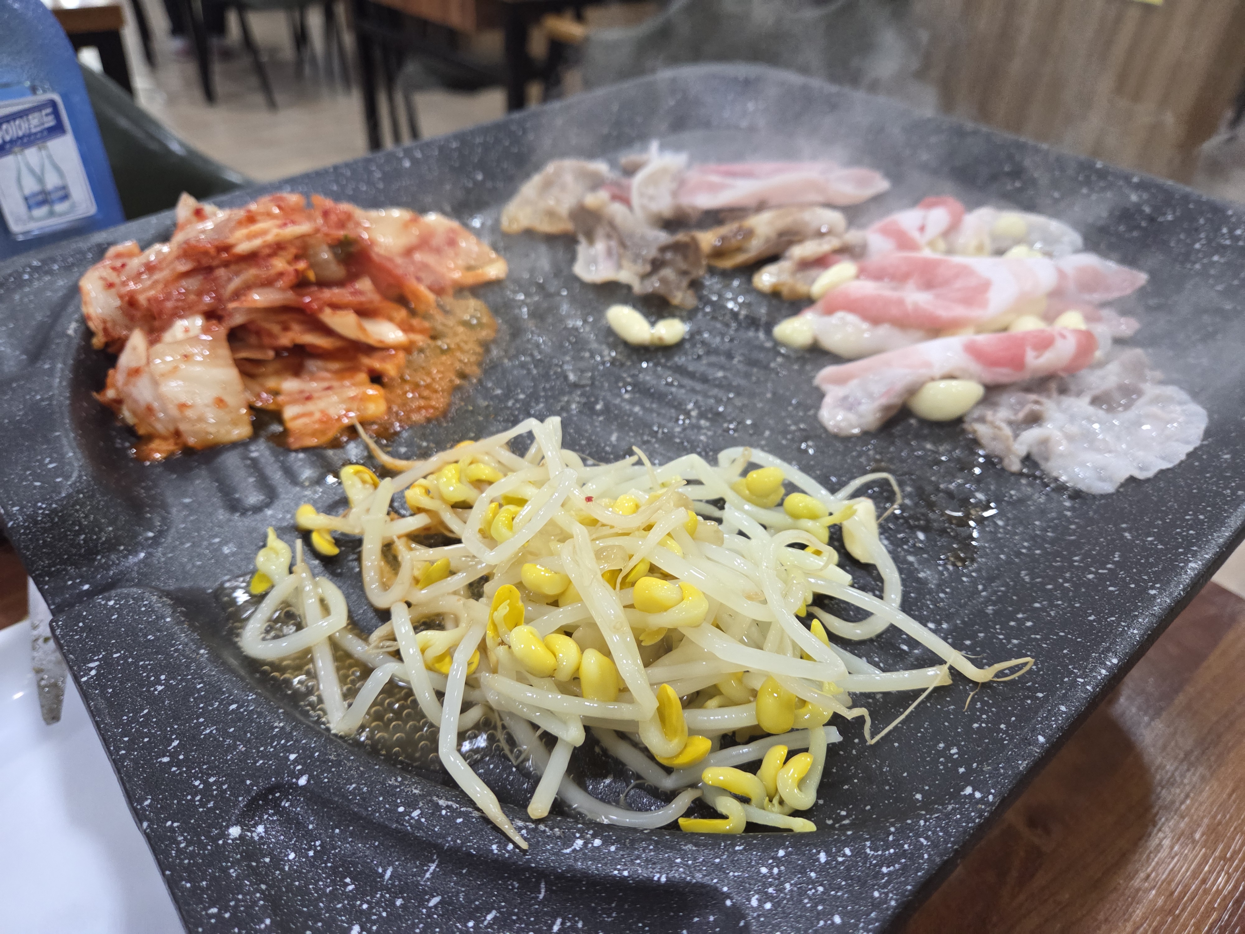 달궈진 불판에 대패삼겹살 올리고 마늘.콩나물.김치도 같이 올려