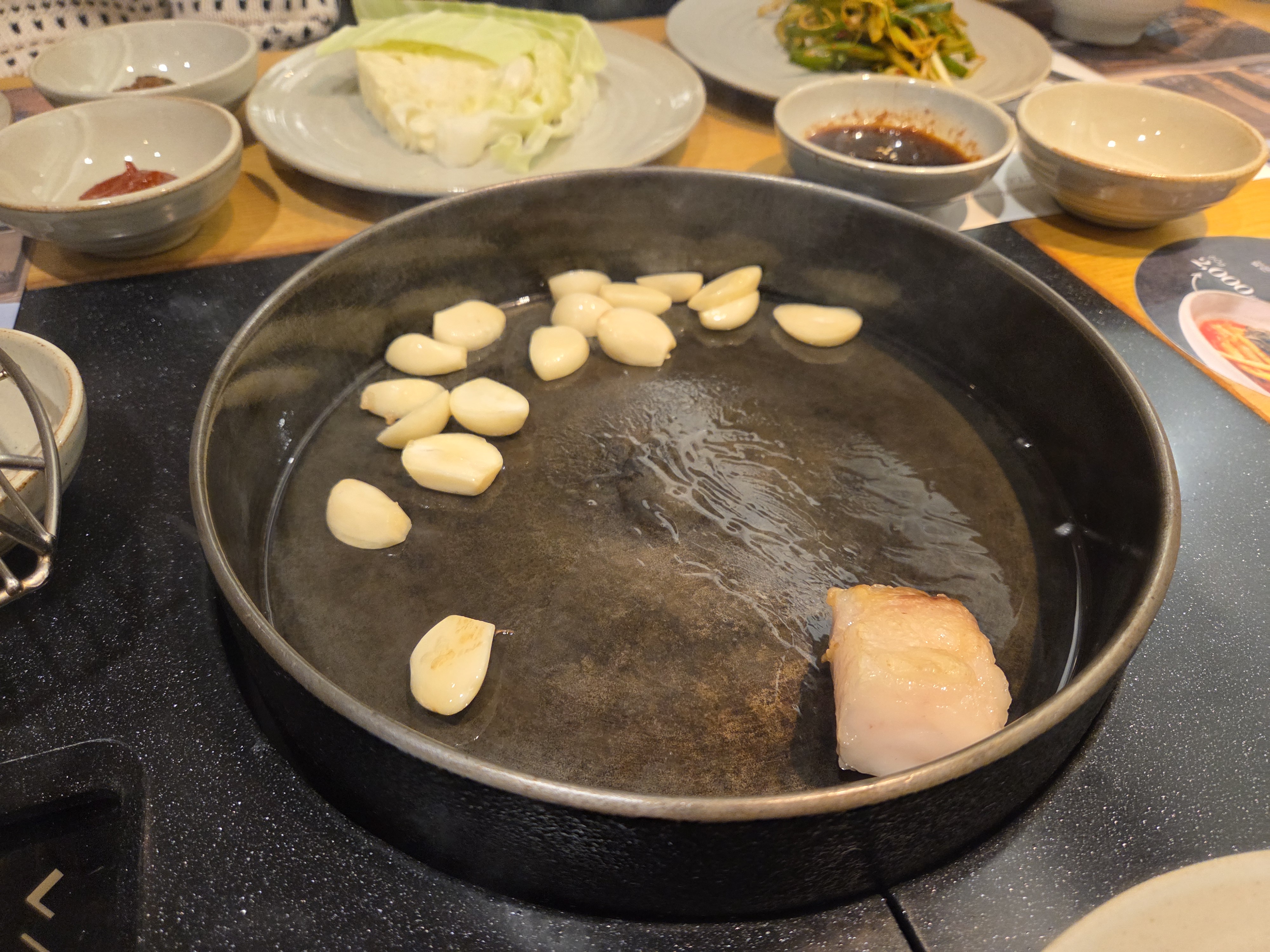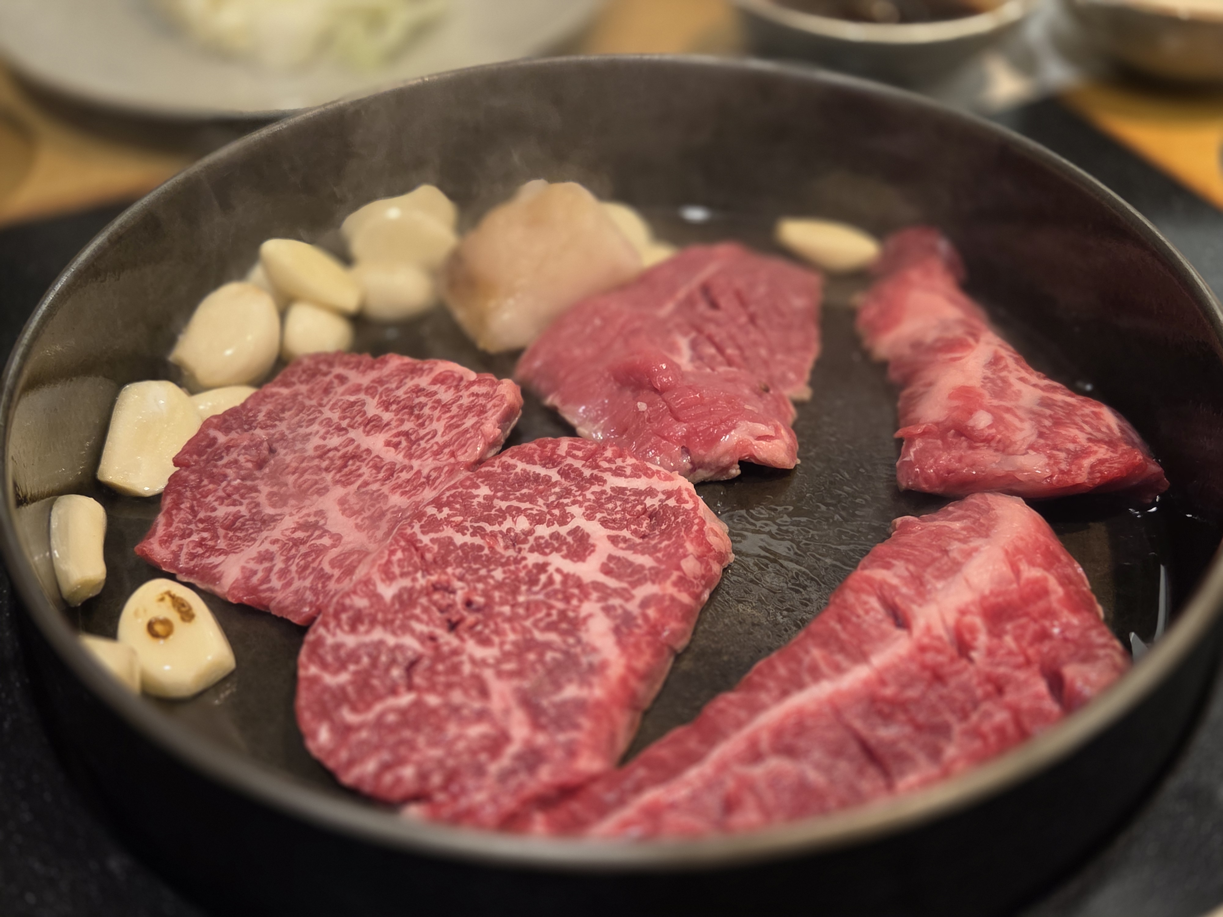 달궈진 무쇠판 위에 지방으로 코팅 후 고기를 올리면 취~익