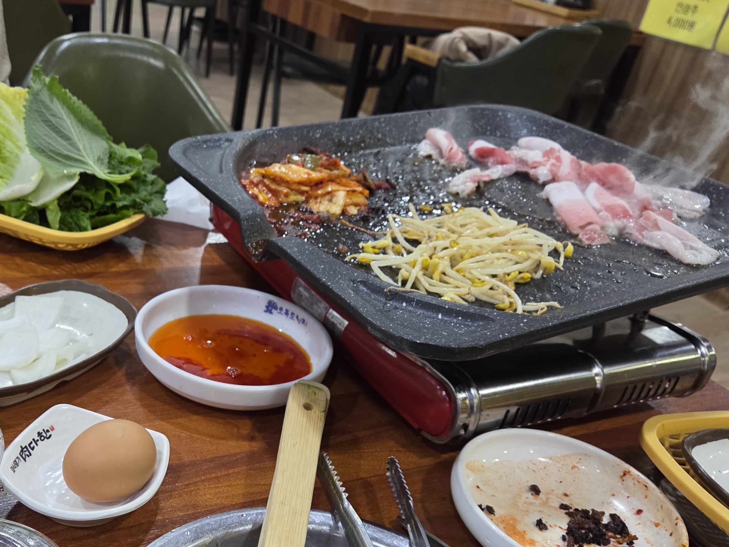 노랗게 잘구워지면 대패에 파채랑 김치 콩나물 마늘 땡초 올려..쌈으로도 먹고..