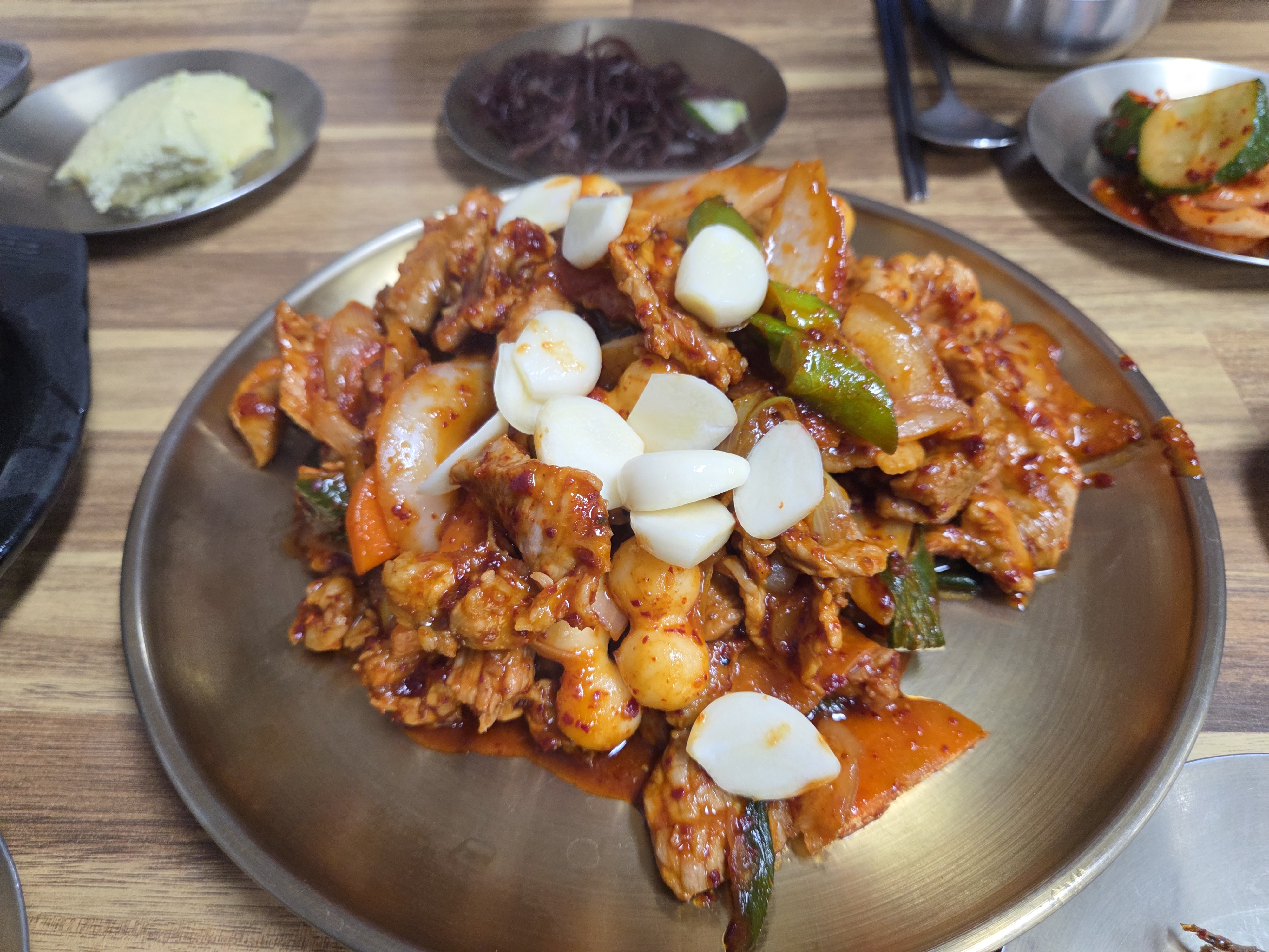 두루치기에 마늘편과 올갱이떡도 같이 먹고..