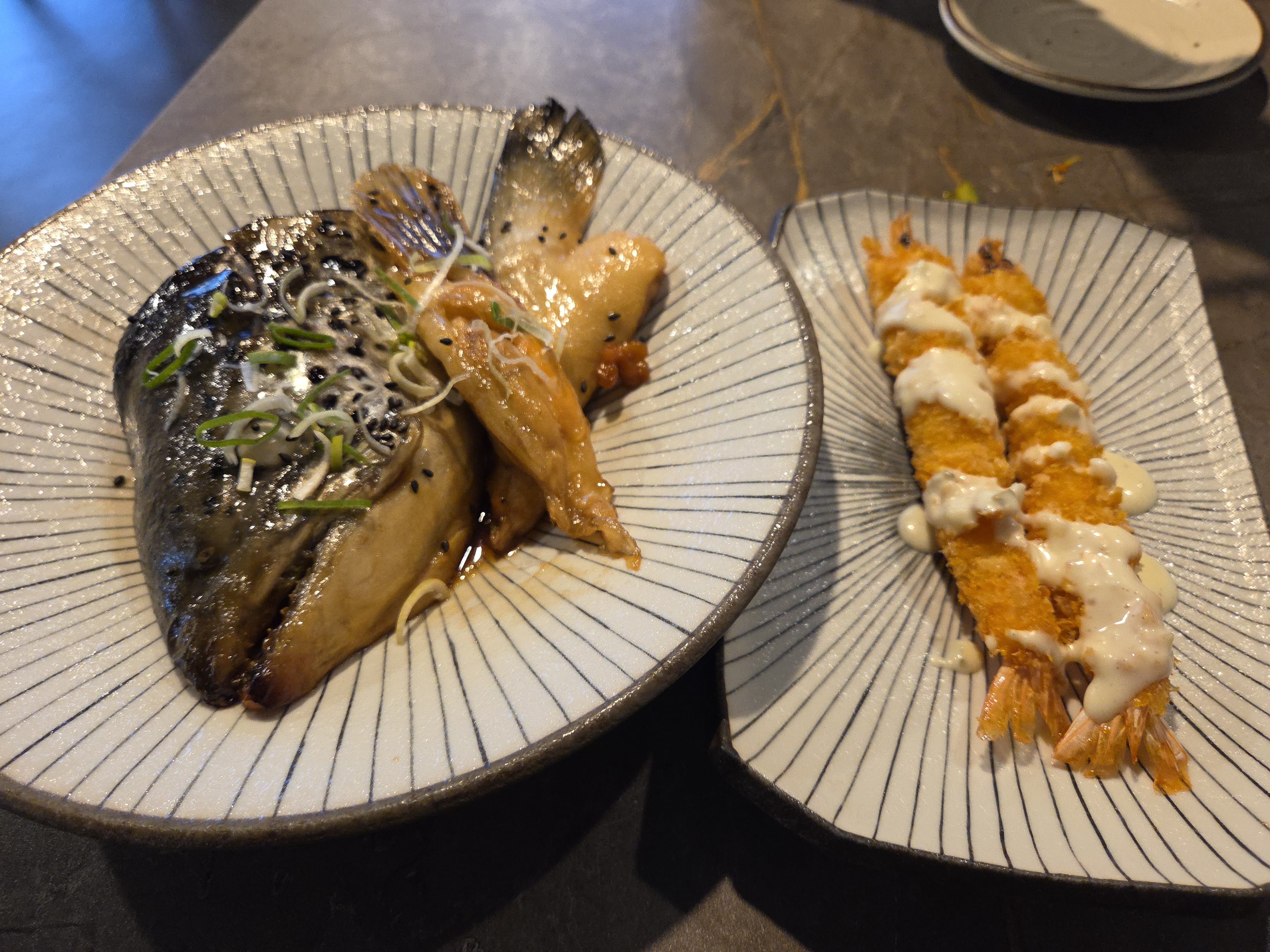 연어머리 조림과 왕새우튀김..