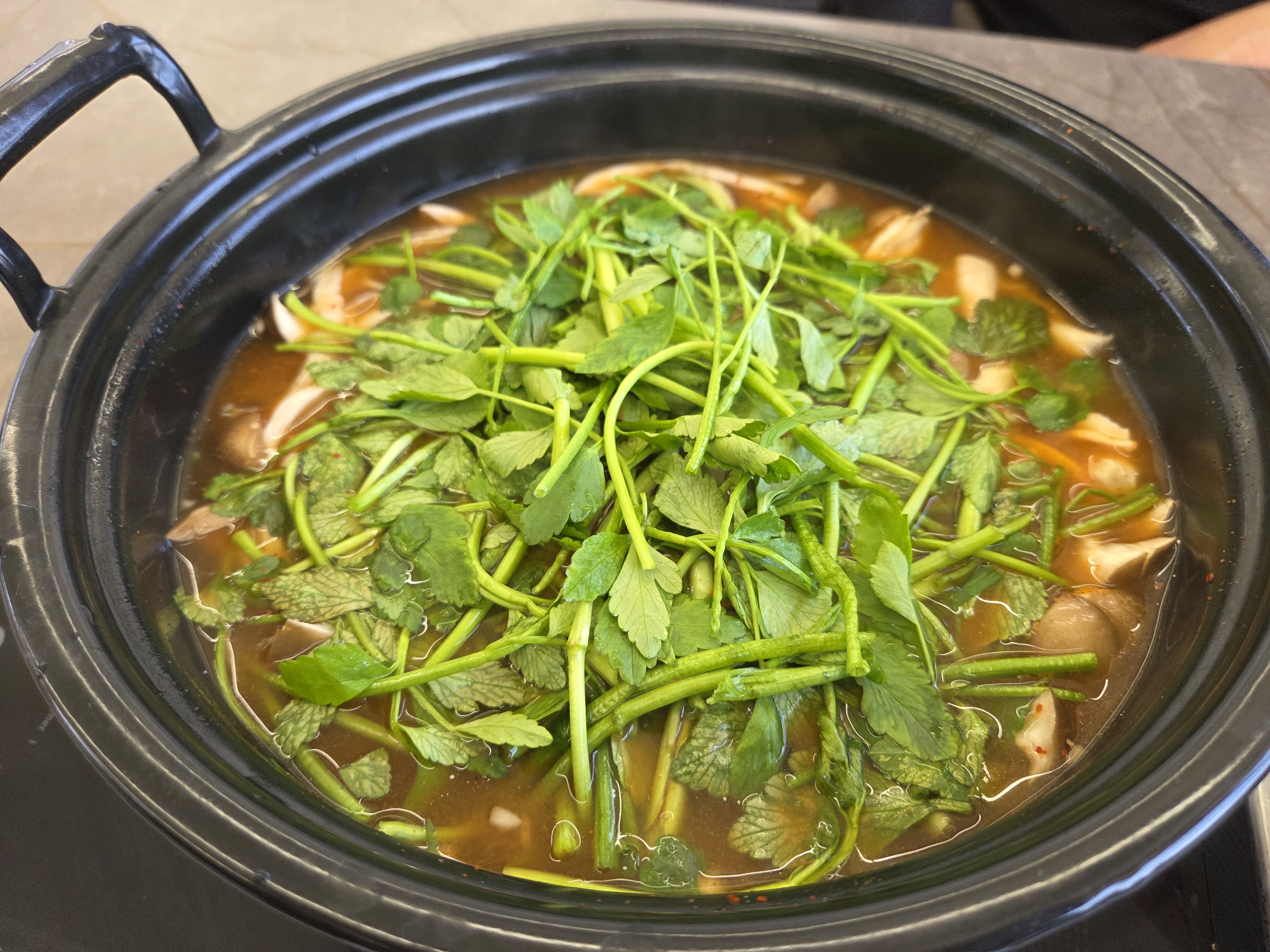 얼큰육수에 미나리와 새송이버섯..팔팔 끓으면