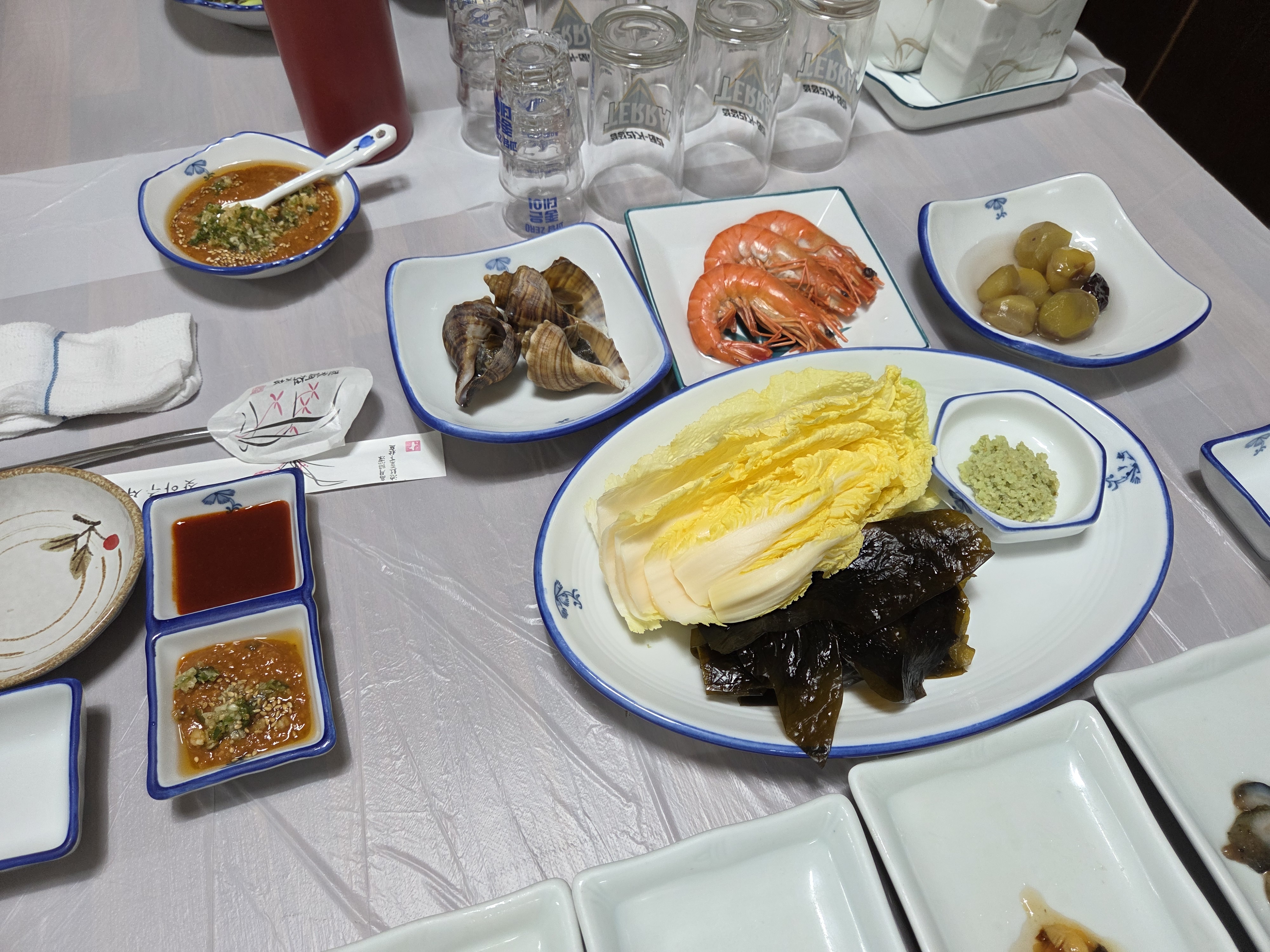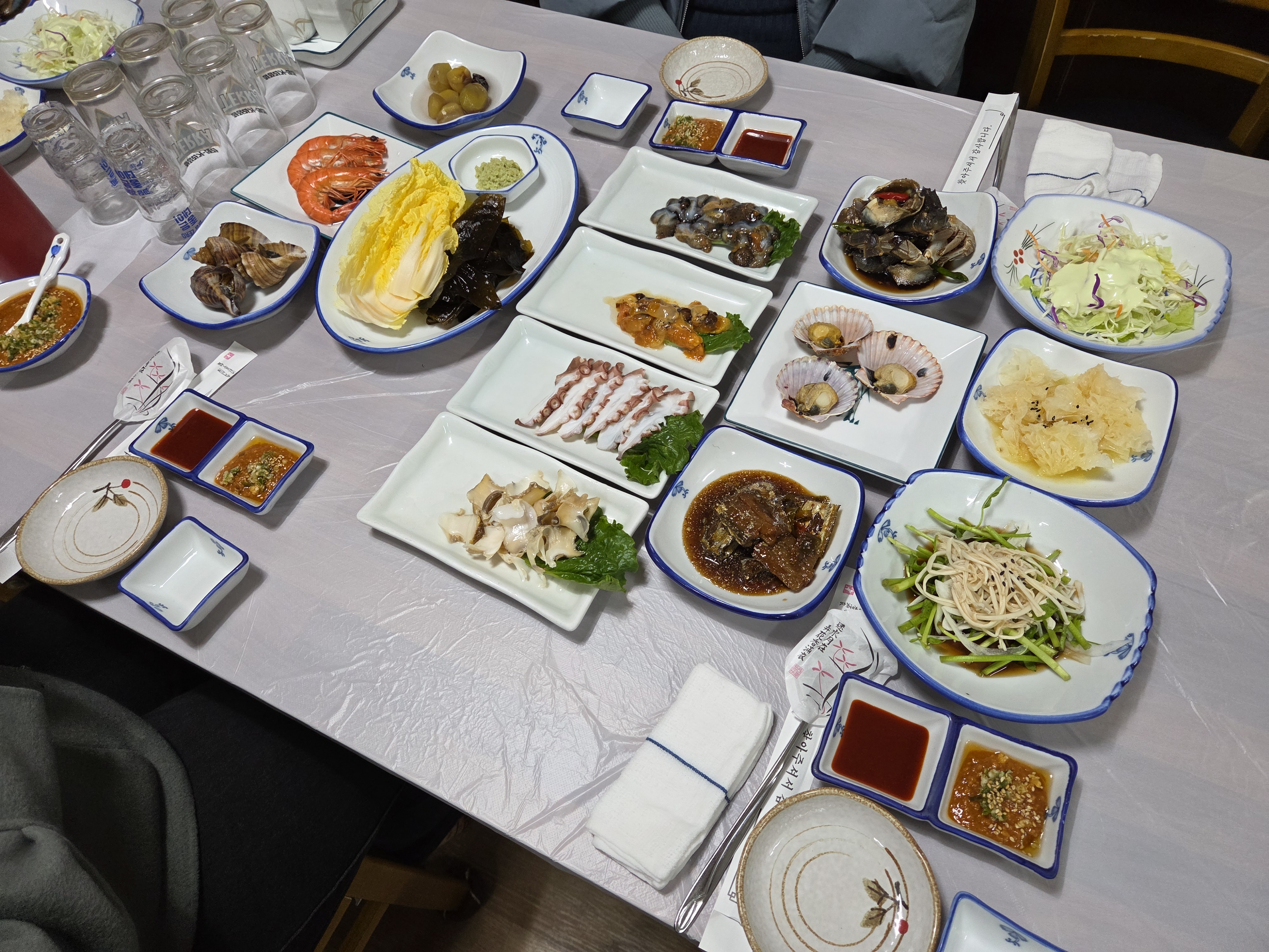 가리비찜.새우찜.밤조림.야채샐러드.배추속.생미역.팽이버섯무침..등등..열심히 먹다보면