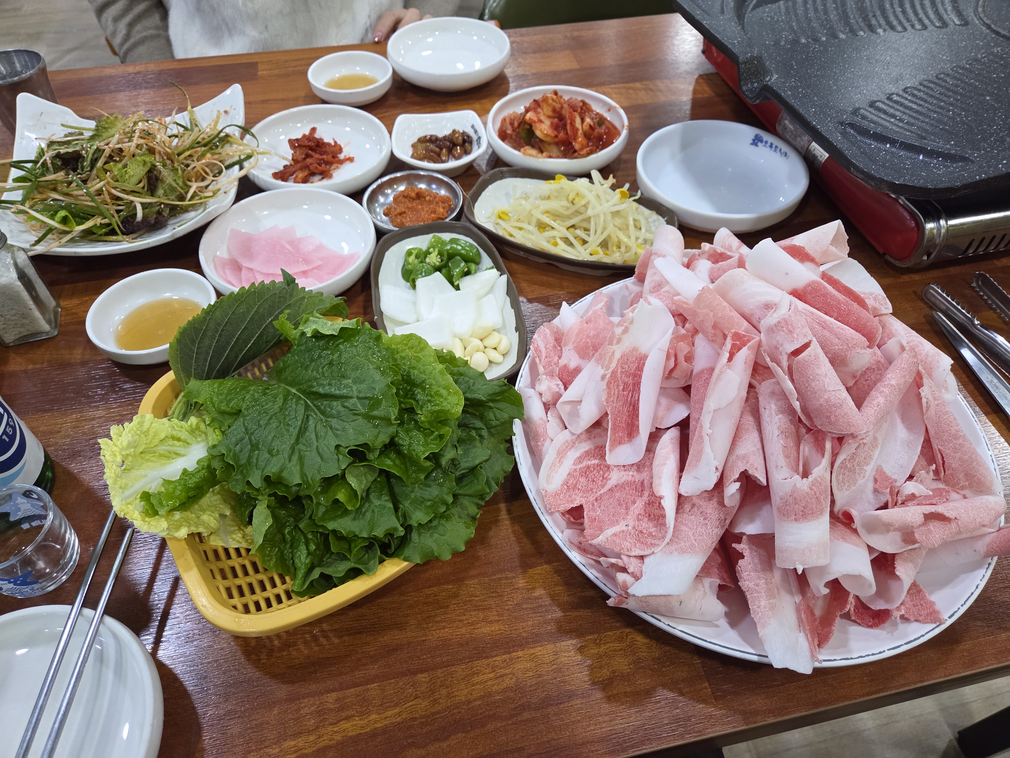 영일삼계탕초량화승갈비..대패삼겹살이 땡겨..2인상국내산대패삼겹살 500gm주문..불판 먼저 달구고..기본 찬들..김치.콩나물.무말랭이.땅콩조림.마늘.양파.고추.식초무편.배추.깻잎.상추..등이 나오고달궈진 불판위에 대패올리고김치와 콩나물도 같이 올리고마늘도 올려 굽고..노랗게 잘구워지면 대패에 파채랑 김치 콩나물 마늘 땡초 올려..쌈으로도 먹고..고기위주로도 먹고..250gm 추가..계속 먹다가 고기가 반 정도 남으면 공기밥.된장찌개주문남은 고기 올리고 김치 콩나물.다같이 잘게 썰어 볶다가 공기밥 투하하여 볶다가 김가루와 생계란 투하하여골고루 볶아줍니다.된찌랑 같이 새로운 안주로 등장..배불리 맛있게 잘먹었네요..자판기 커피도 한 잔..